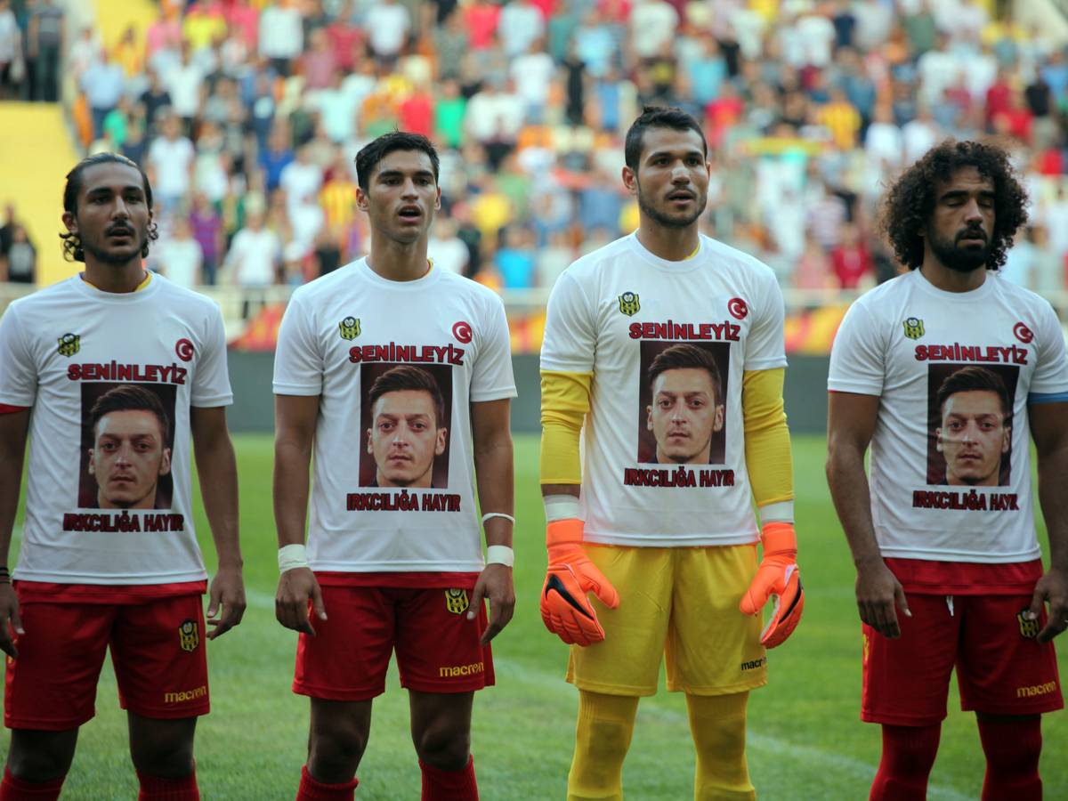 Turkischer Verein Yeni Malatyaspor Lauft Mit Trikots Mit Gesicht Von Mesut Ozil Ein